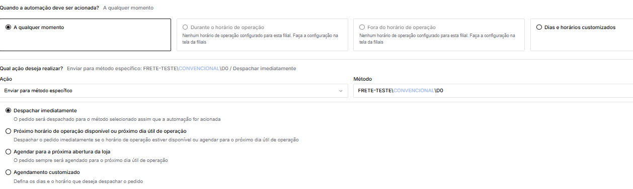 - A automação de despacho é aplicada no momento da criação do pedido;