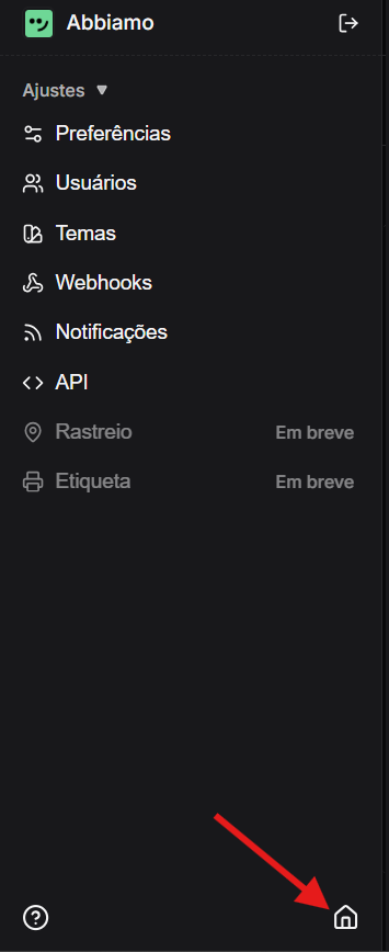 - Clique no ícone de casa ? localizado no rodapé do menu lateral para abrir o painel de Configurações.