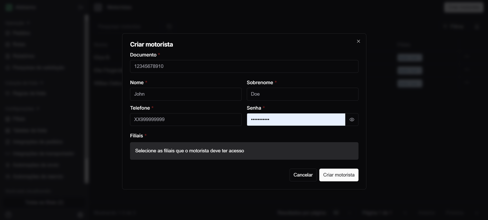 - Clique em “Criar Motorista”.