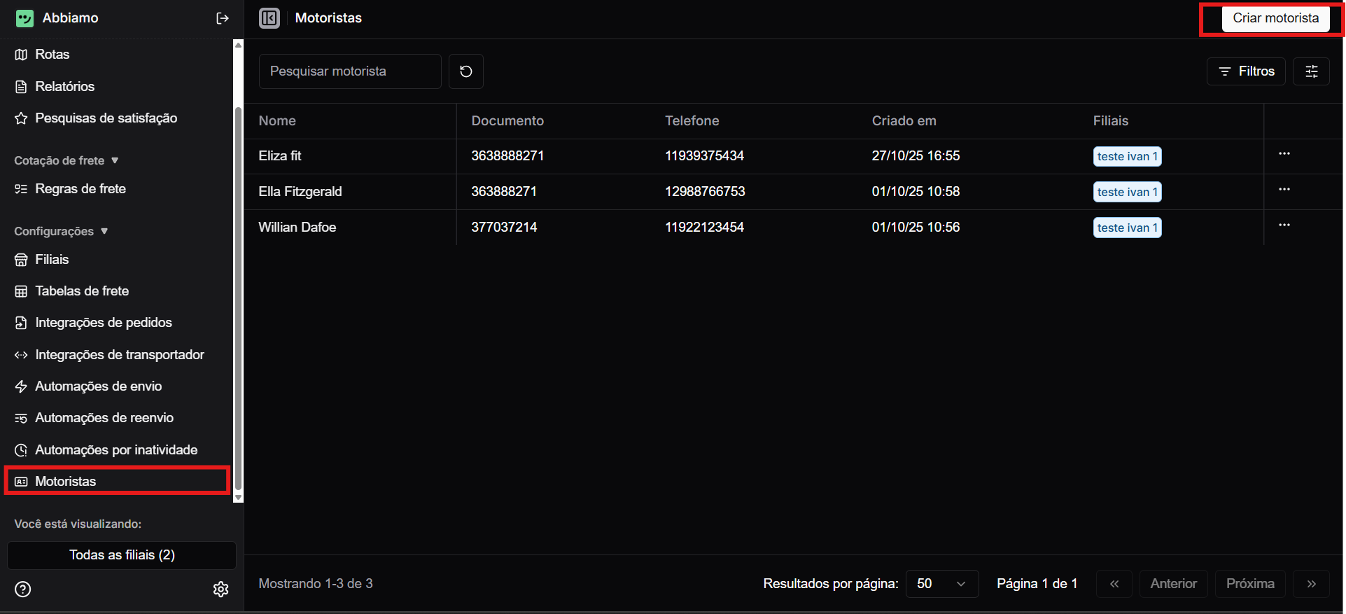- Ver motoristas: para editar a(s) filial(is) associada(s);