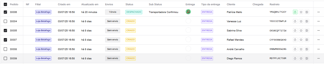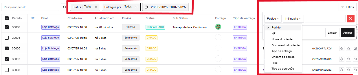 Também é possível utilizar filtros por Status, Transportadora, Data, entre outrou critérios, para que apareçam na página apenas os pedidos desejados.