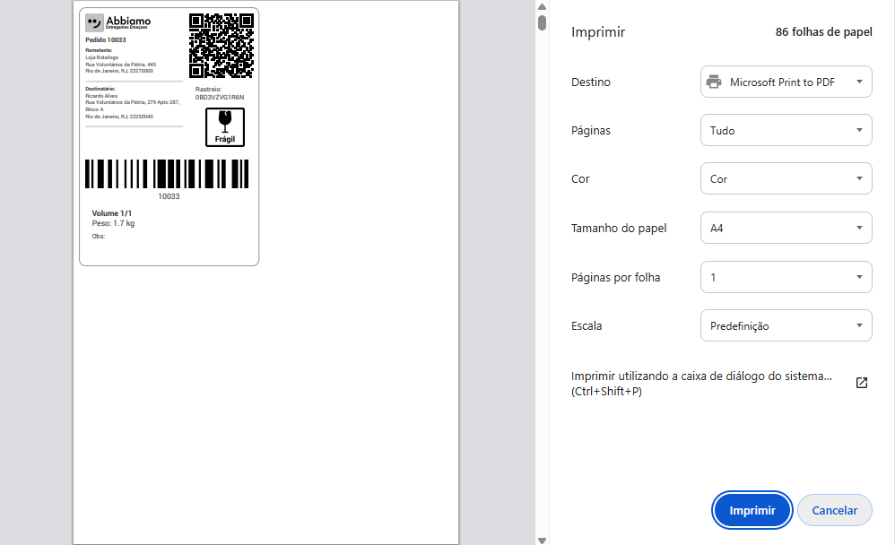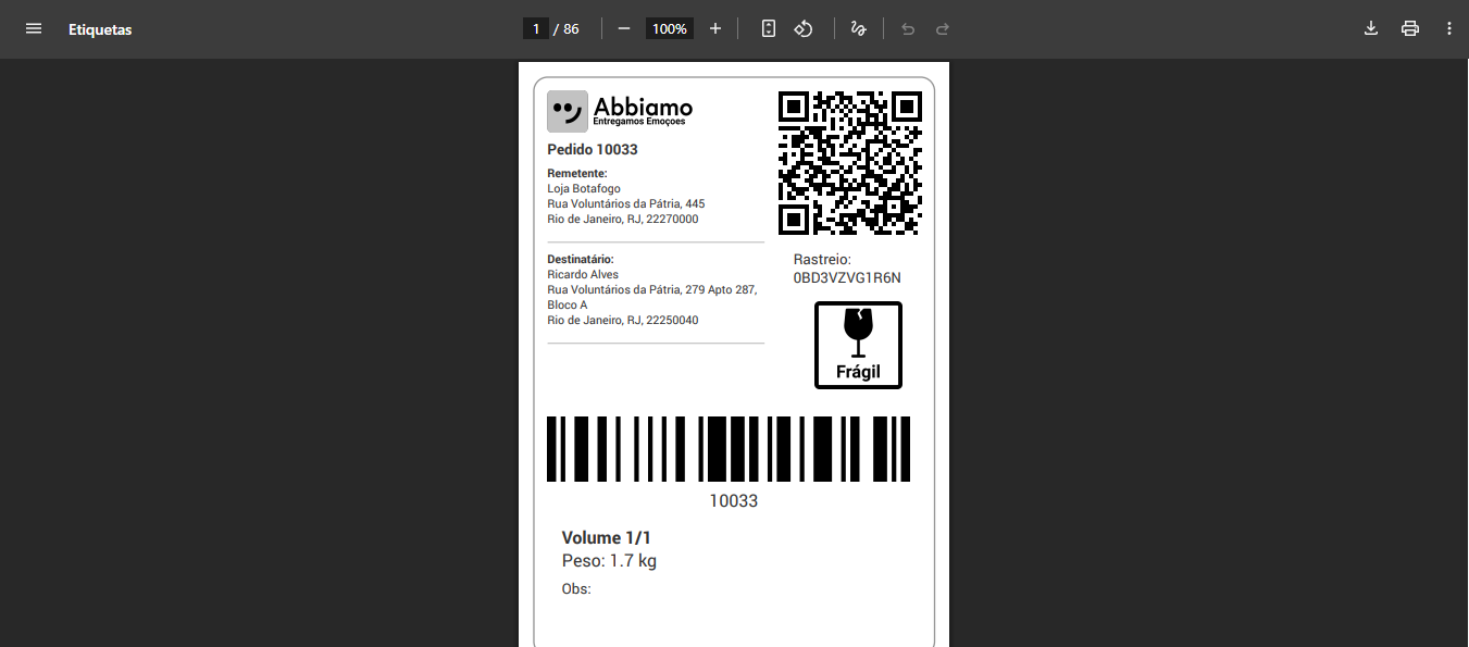 Depois de selecionada a opção "Etiqueta", será aberta uma nova aba no seu navegador com o arquivo das etiquetas pronto para a impressão. Para imprimir basta clicar no ícone de impressora no topo da tela.