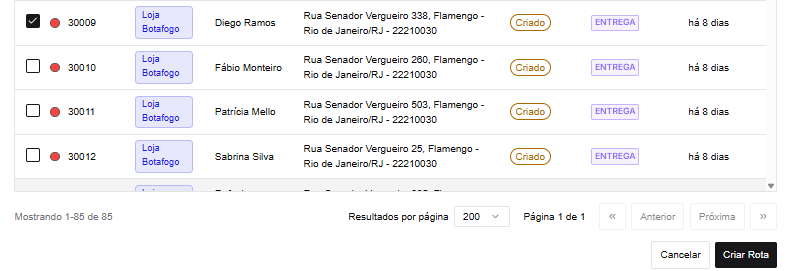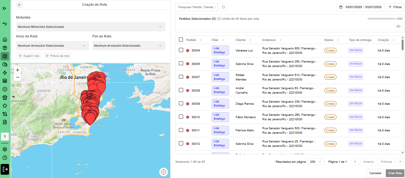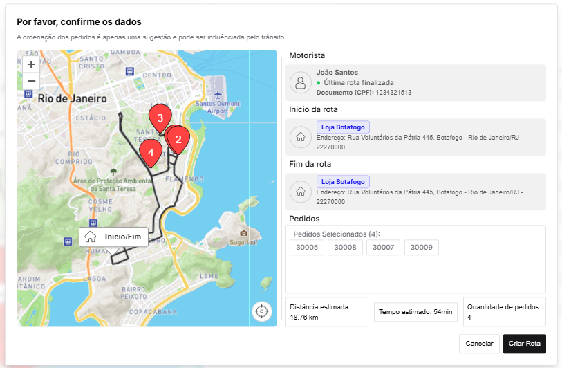 - Uma vez preechidos o campo de motorista, início e final da rota e selecionados os pedidos, no canto inferior direito será habilitada a opção "Criar Rota".