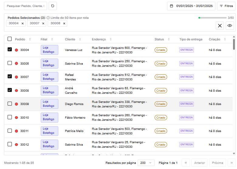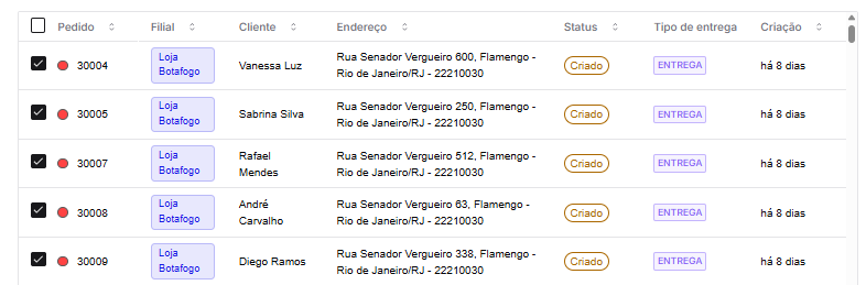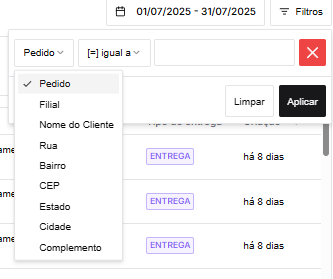 Também é possível utilizar filtros por Data, Bairro, Filial, entre outrou critérios, para que apareçam na página apenas os pedidos desejados.
