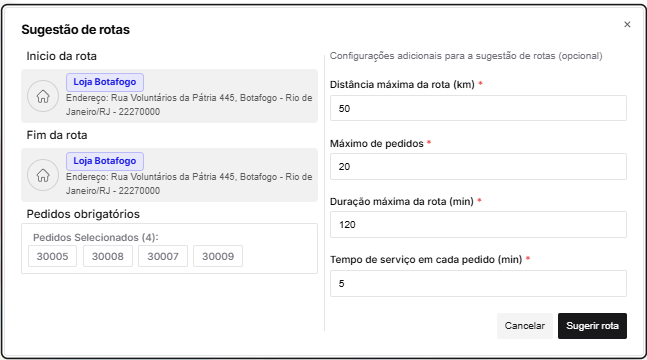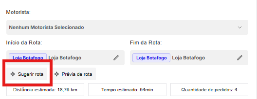- Se você deseja que o sistema sugira quais pedidos devem entrar na rota sem ter que selecioná-los manualmente, basta selecionar um ou mais pedidos e clicar em "Sugerir Rota"