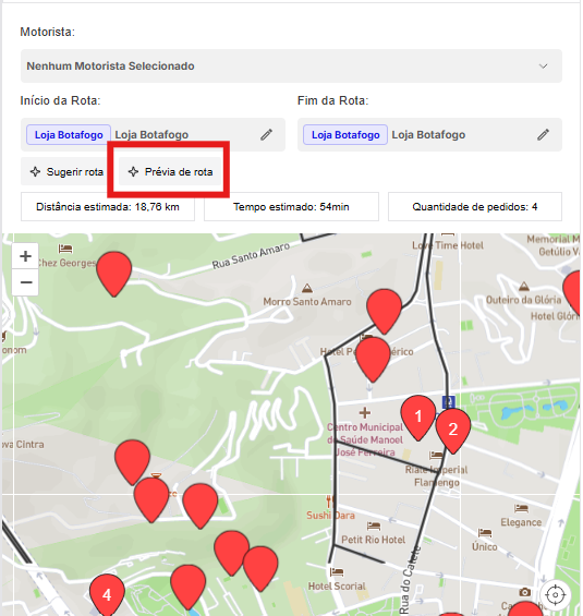 - Se você deseja apenas ordenar de maneira otimizada os pedidos que escolheu, basta clicar na opção "Prévia de Rota", e os pedidos selecionados no painel lateral serão ordenados de maneira a gerar a melhor rota.