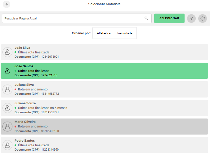 - Selecionando essa opção vai aparecer a lista de motoristas associados à loja em questão e se estão realizando alguma rota no momento. Escolhido o motorista, basta clicar em "Selecionar".