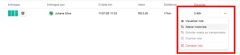 2. Selecione os três pontinhos e depois a opção "Alterar Motorista"