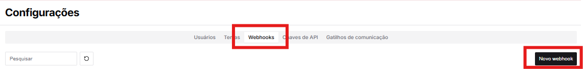 - Depois disso, vá até a aba "Webhooks" e selecione a opção de "Novo Webhook".