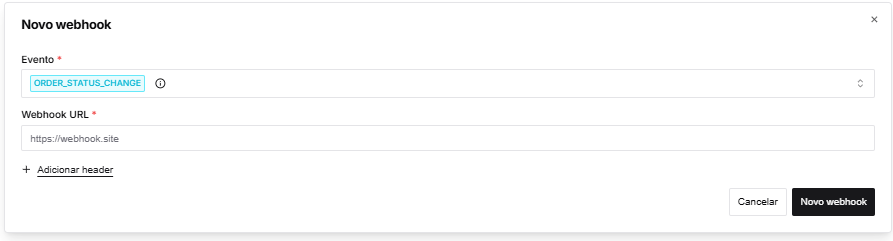 - No menu que será aberto basta informar o tipo de evento desejado (order_status_change ou order_receiver_update, detalhamento na documentação) e informar a URL do Webhook.