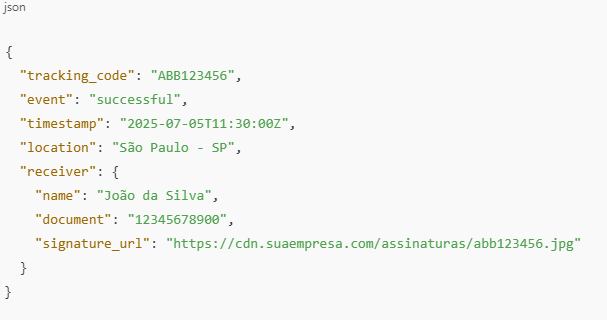 Caso o processo inclua coleta de assinatura do recebedor, a transportadora deve hospedar esse arquivo em servidor próprio e incluir a URL no campo signature_url.