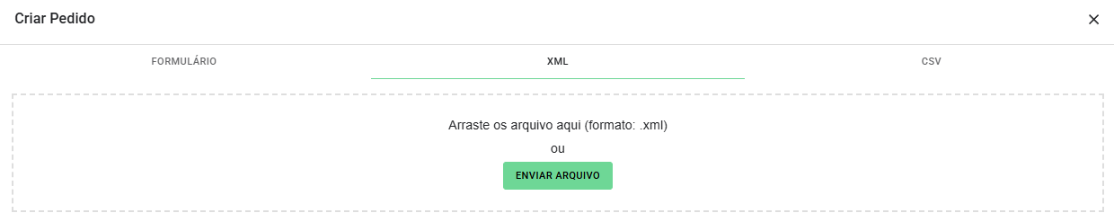 A plataforma oferece três opções para criar pedidos, você pode obter o documento modelo/template na própria plataforma: