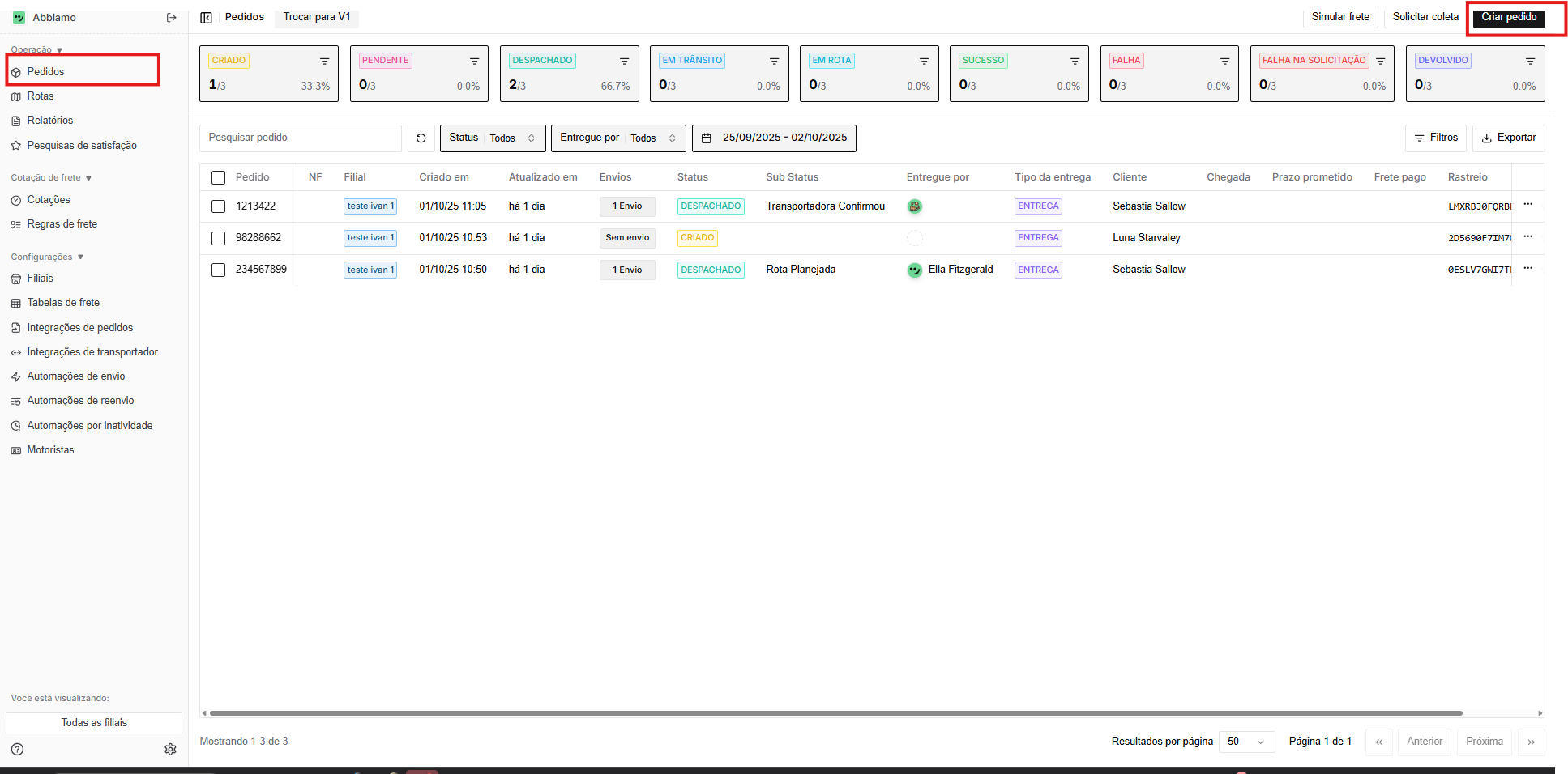Clique em Criar pedido no canto superior direito da tela.