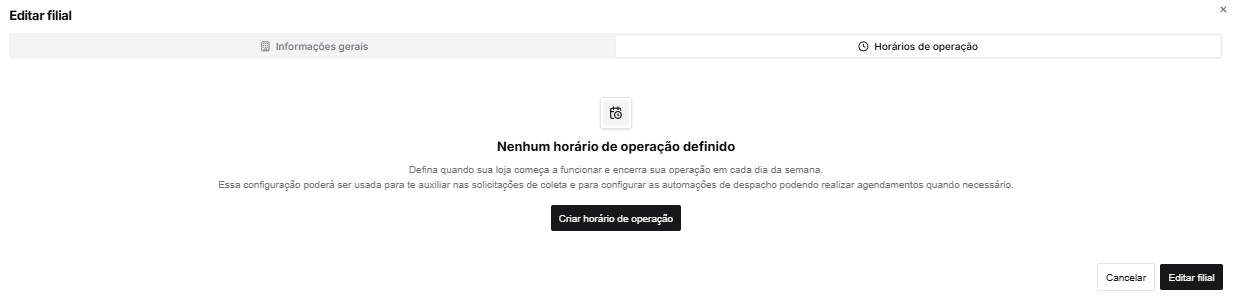 Na janela de edição da filial, clique na aba Horários de operação, localizada no topo.