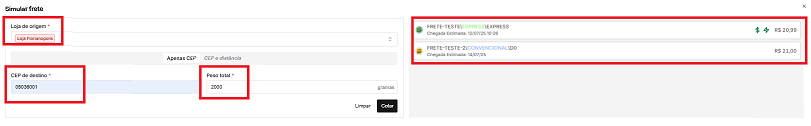 - Os resultados exibidos são baseados nas tabelas de frete cadastradas na plataforma;