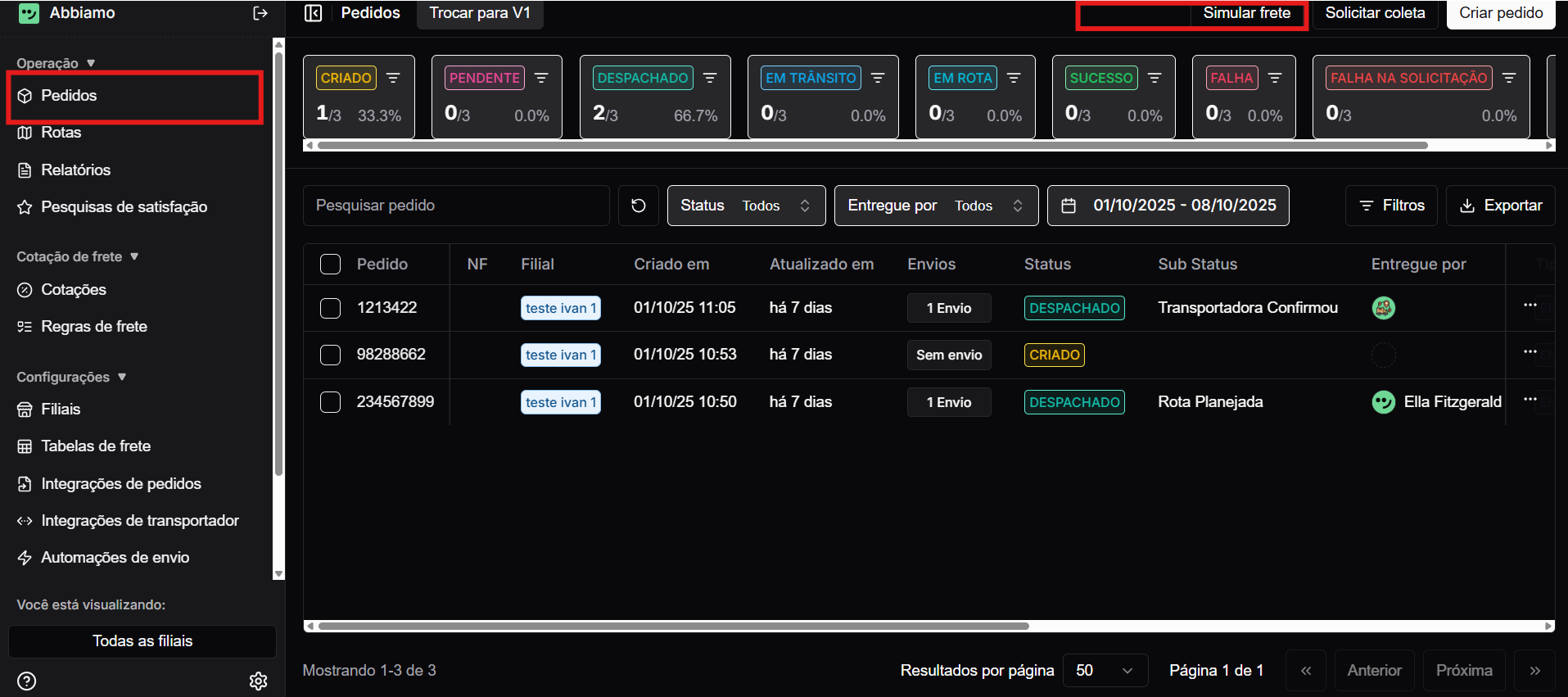 Este artigo orienta como utilizar o recurso de Simulação de Frete na plataforma Abbiamo. A funcionalidade permite consultar rapidamente os valores disponíveis nas tabelas de frete cadastradas para diferentes destinos e pesos, sem necessidade de criar um pedido.