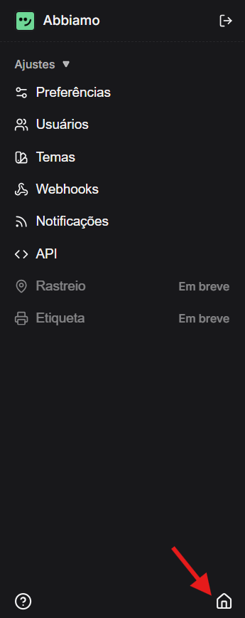 - Clique no ícone de casa ? localizado no rodapé do menu lateral para abrir o painel de Configurações.