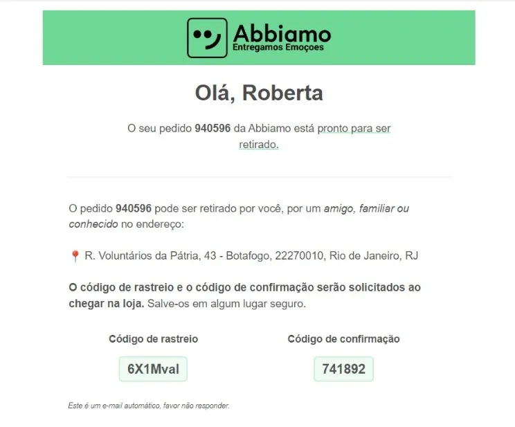 Ao ser marcado como pronto para retirada, o cliente receberá por e-mail dois códigos: