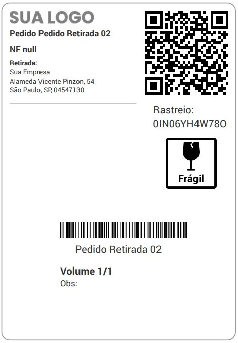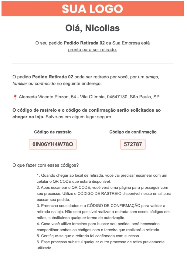 Assunto: Olá, (nome do cliente)! O seu pedido da (nome da sua marca) está pronto para retirada. Código: (código de rastreio)