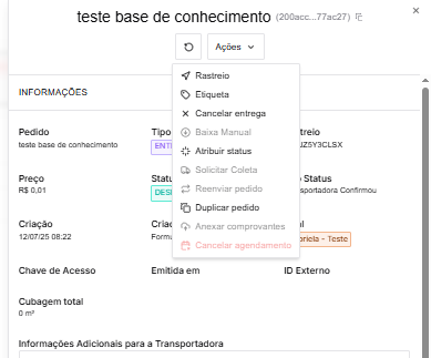 • Nesses casos, o cancelamento deve ser solicitado à transportadora fora do sistema, e o pedido poderá seguir o fluxo normal, como devolução ou falha;