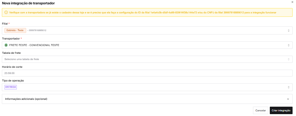 As credenciais são solicitadas de acordo com a transportadora selecionada. Algumas podem solicitar somente o Token, outras Client ID ou senhas. As credenciais são fornecidas pela transportadora.