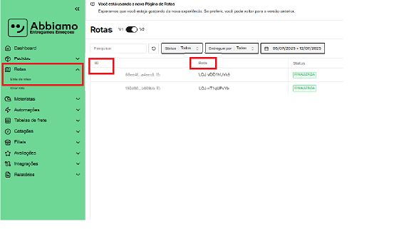 Para visualizar o ID de uma rota, acesse o menu lateral Rotas. No topo da tabela, serão exibidos os dados da rota. O ID da rota é mostrado na coluna ID, e o código da rota (visível ao motorista) aparece na coluna Rota.