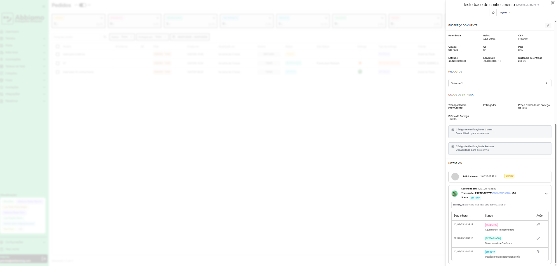 Na seção Histórico, localize o status mais recente com a entrega atribuída. O Delivery ID aparecerá abaixo do nome da transportadora. Lembre de selecionar o Delivery ID correpondente ao pedido/transportador em questão.
