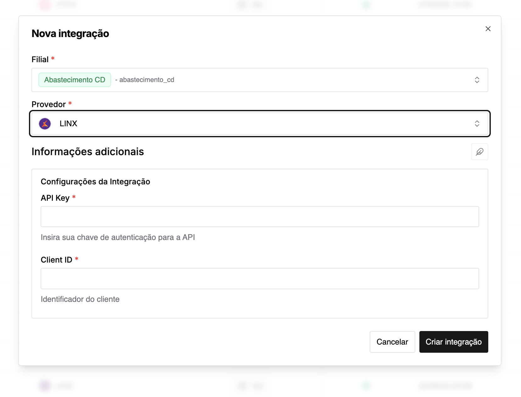 - Após selecionar o provedor, serão exibidos os campos obrigatórios. Preencha os dados fornecidos pelo integrador. (No exemplo abaixo, as credenciais da Linx são:)