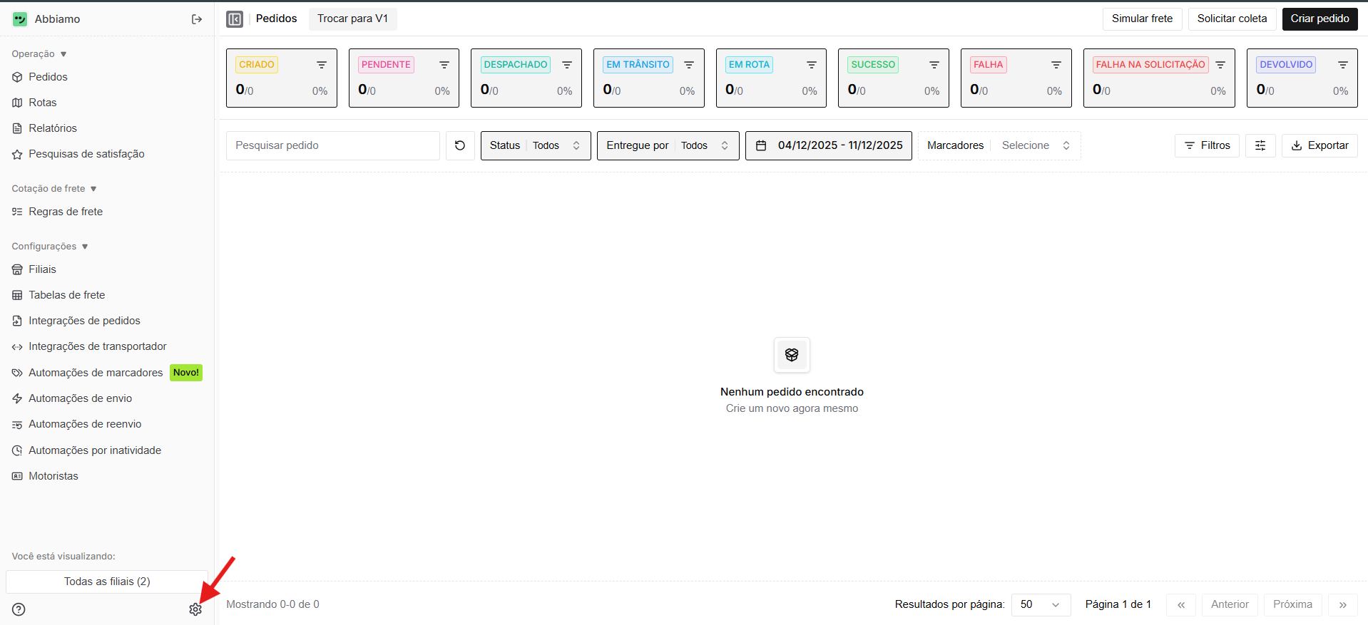 - Na tela de pedidos (ou em qualquer tela principal da plataforma), vá até o canto inferior esquerdo e clique no ícone de engrenagem (⚙️) para abrir o menu Ajustes.