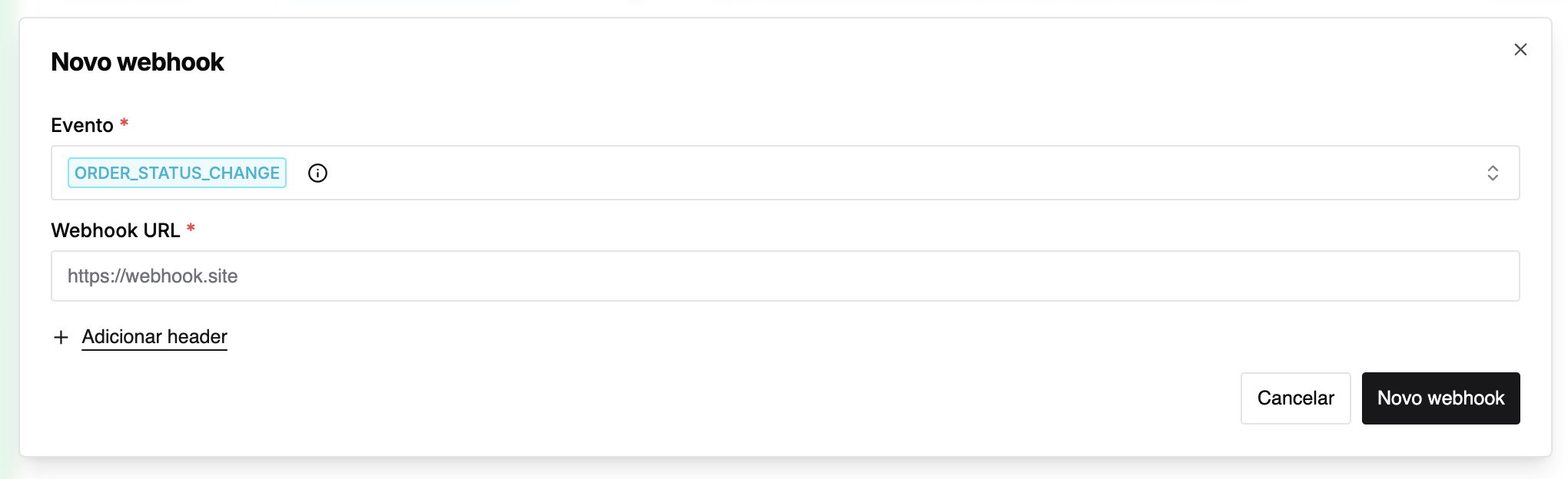 (Opcional) Clique em Adicionar header para incluir headers personalizados na requisição do webhook, se necessário.