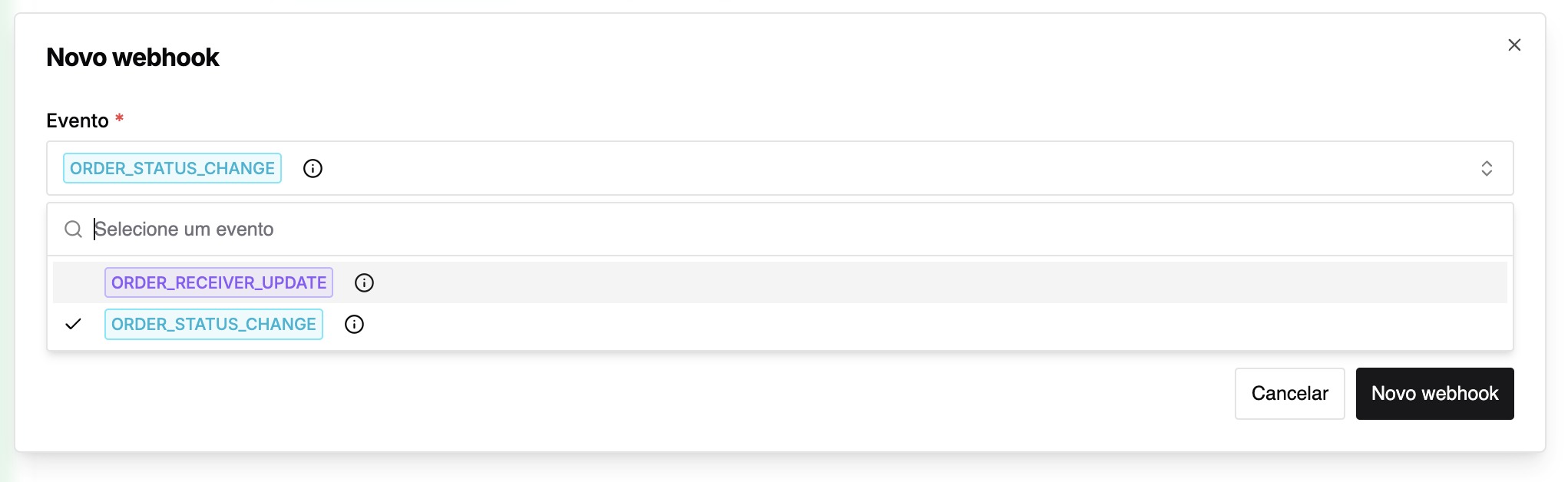 No campo Evento, clique para abrir a lista de eventos disponíveis e selecione o evento desejado, como ORDER_STATUS_CHANGE ou ORDER_RECEIVER_UPDATE.