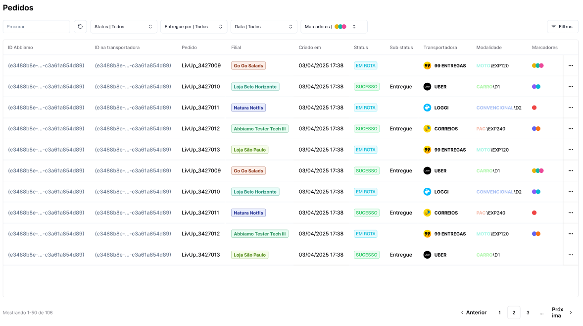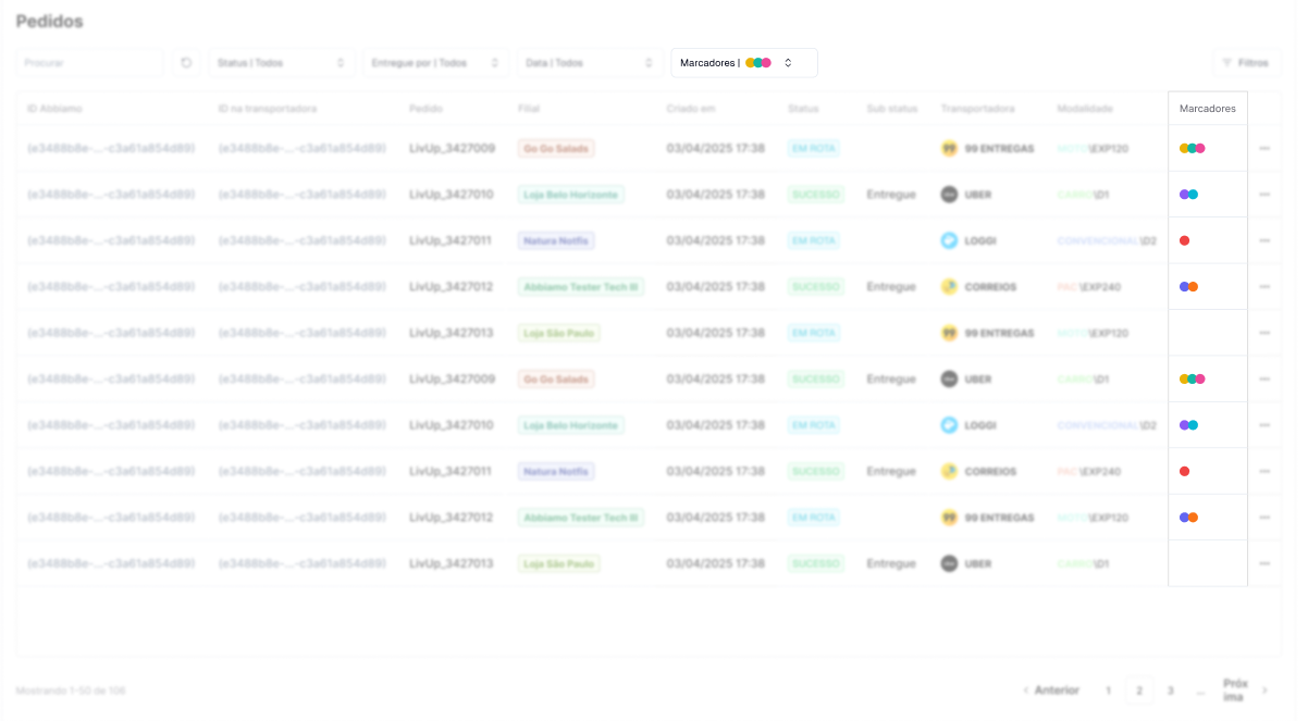 Na Abbiamo, os marcadores aplicados a um pedido podem ser visualizados na tela principal de pedidos, como é possível ver abaixo.