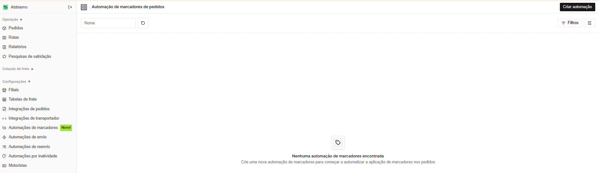 A automação de marcadores de pedidos permite configurar regras para que marcadores sejam aplicados sem intervenção manual, com base em condições específicas. Para criar uma nova regra de automações de marcadores, basta clicar na opção do painel lateral Automações de Marcadores > Criar Automação