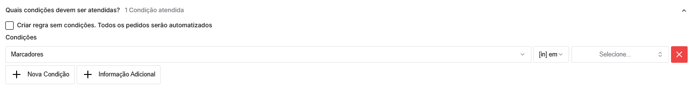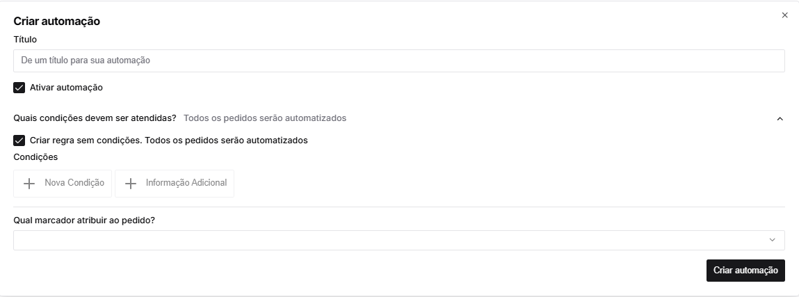 Para a criação da regra é necessário definir o título da automação, as condições para a marcação automática do pedido e o marcador que deve ser atribuído.